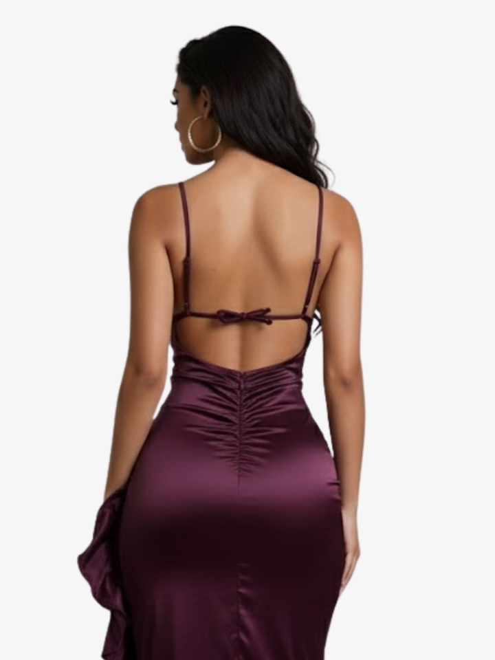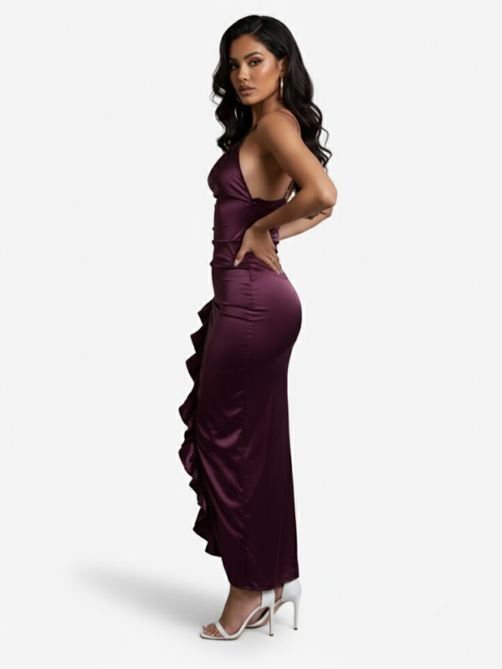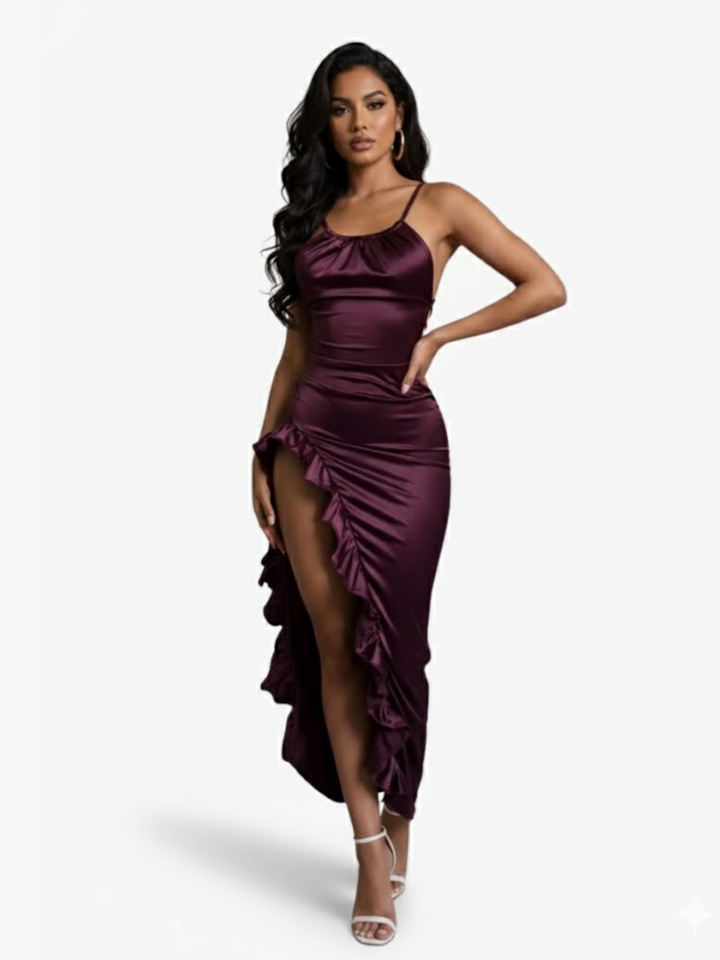 Details: This standout piece features a glossy satin texture, ruched side detailing, and a bold thigh-high ruffle slit for maximum drama. Designed with a one-shoulder neckline and a sculpted waist, this dress transitions seamlessly from upscale events to nightlife—built for movement, attitude, and shine.