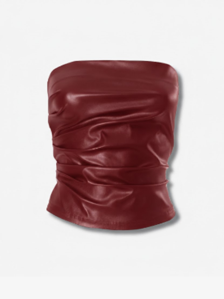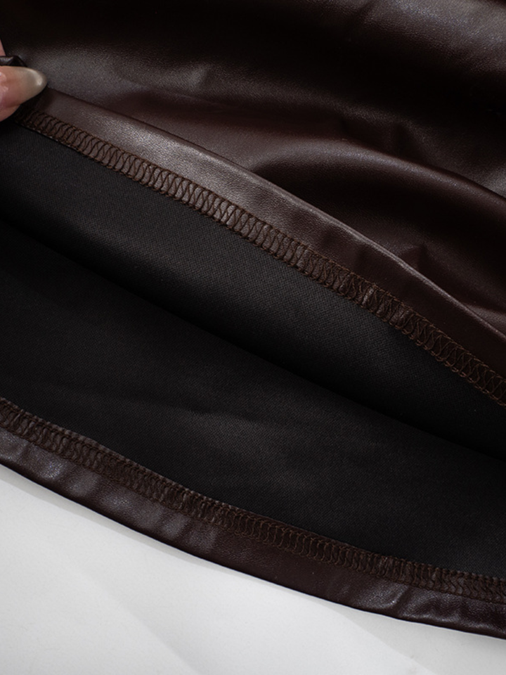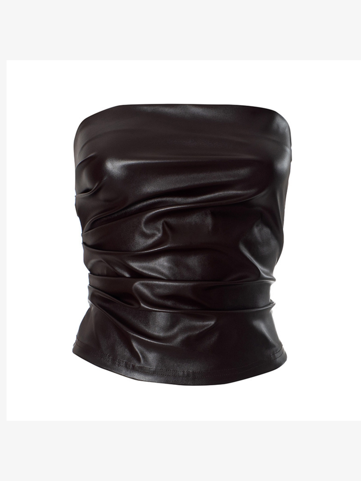 Details: Deep espresso brown finish with a subtle sheen that catches light. Clean top and bottom hems for a seamless, elevated look. No visible closures — slips on for a minimal, modern profile.