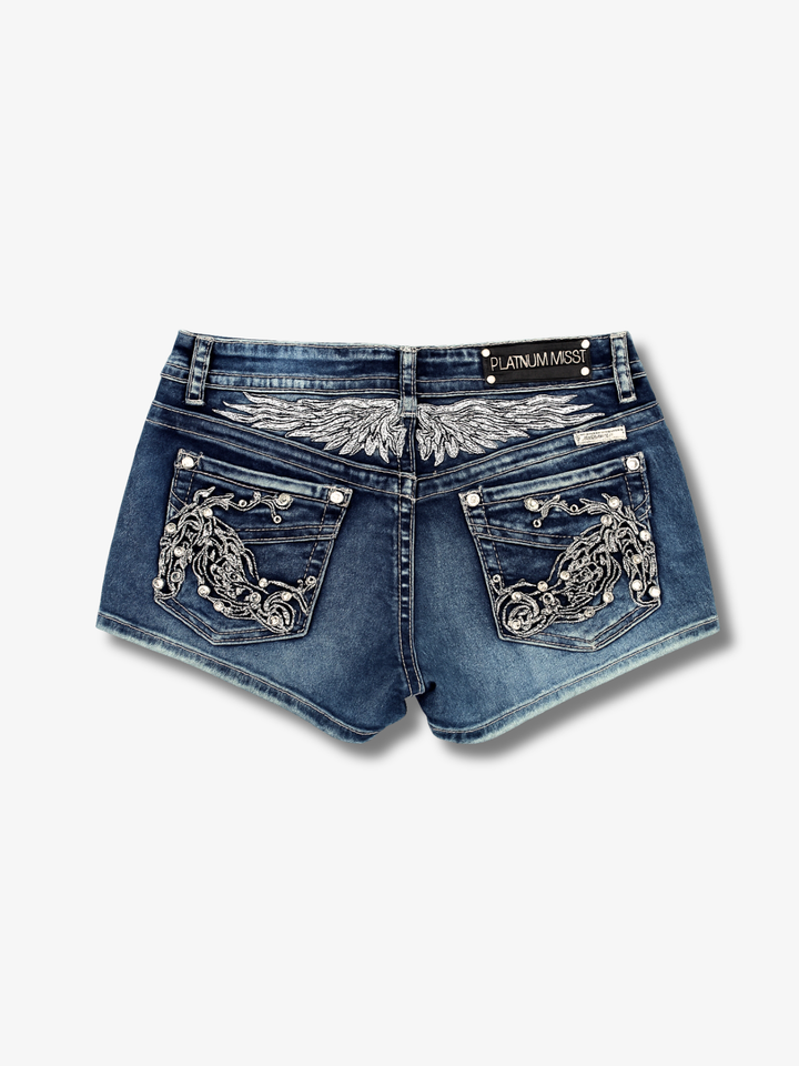 Details: Intricate rhinestone and sequin embroidery on back yoke and oversized flap pockets. Classic 5-pocket build with double-button waist, tonal fading, and a Platinum Patch detail. A standout piece with full Western-glam energy.