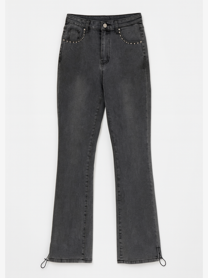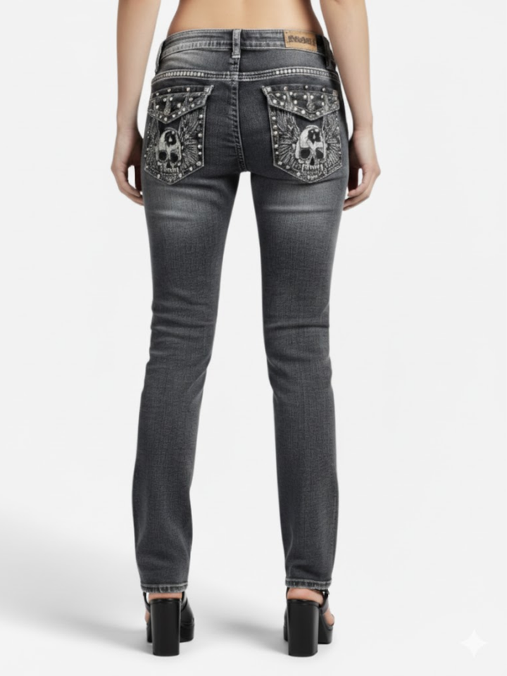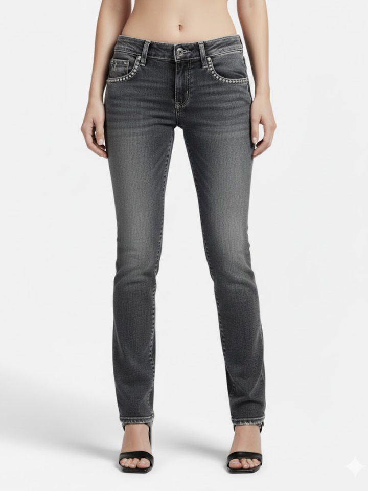 Details: Washed black-gray tone with subtle fading down the leg. Accented with rhinestone embellishments along the front pockets for a bold early-2000s vibe. Finished with a zip fly, five-pocket layout, and clean hems.