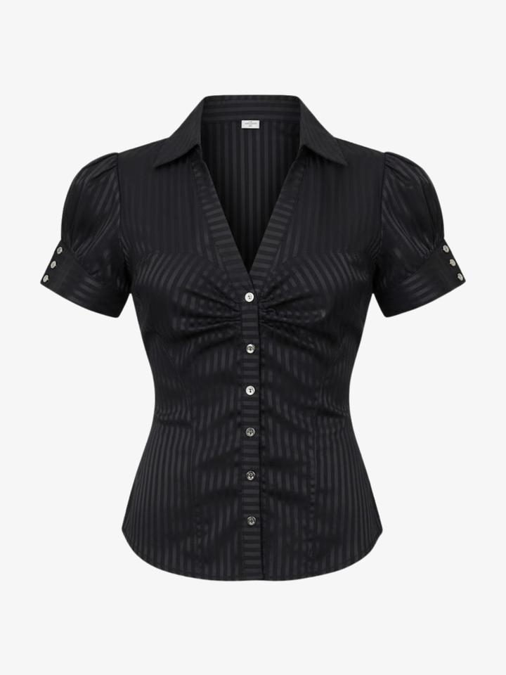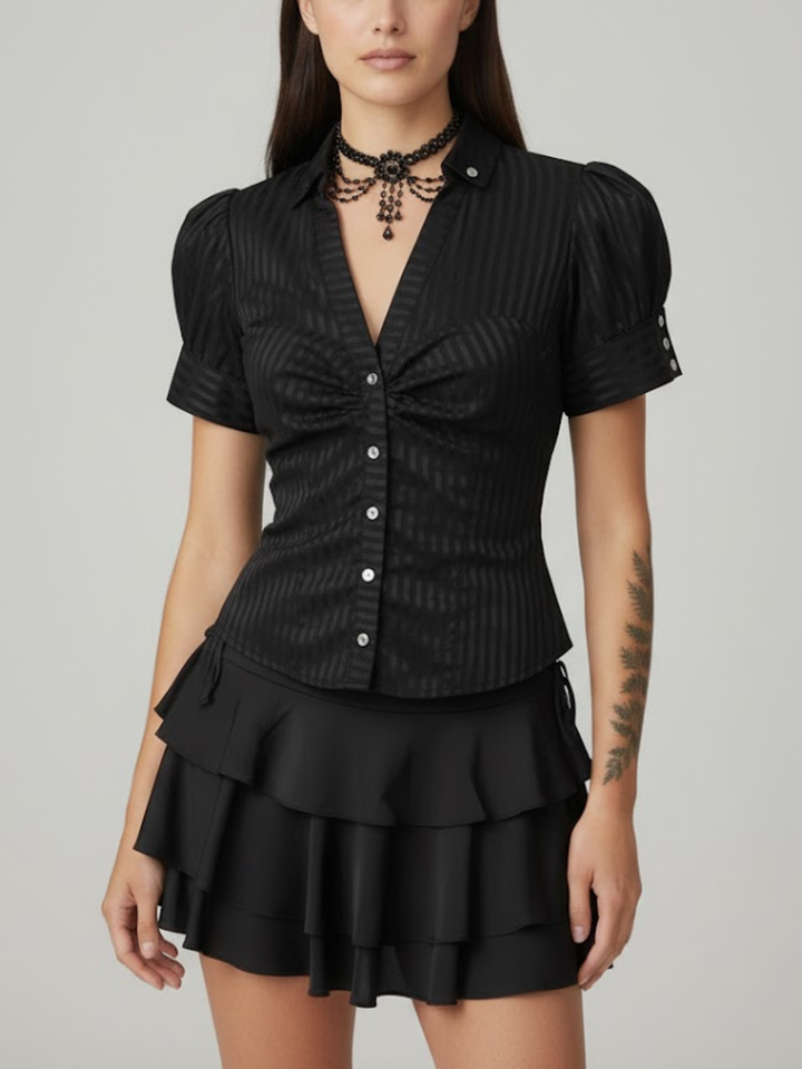 Details: Pinstripe pattern with pleated accents and satin bow details on pockets