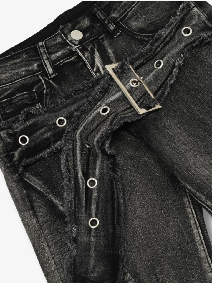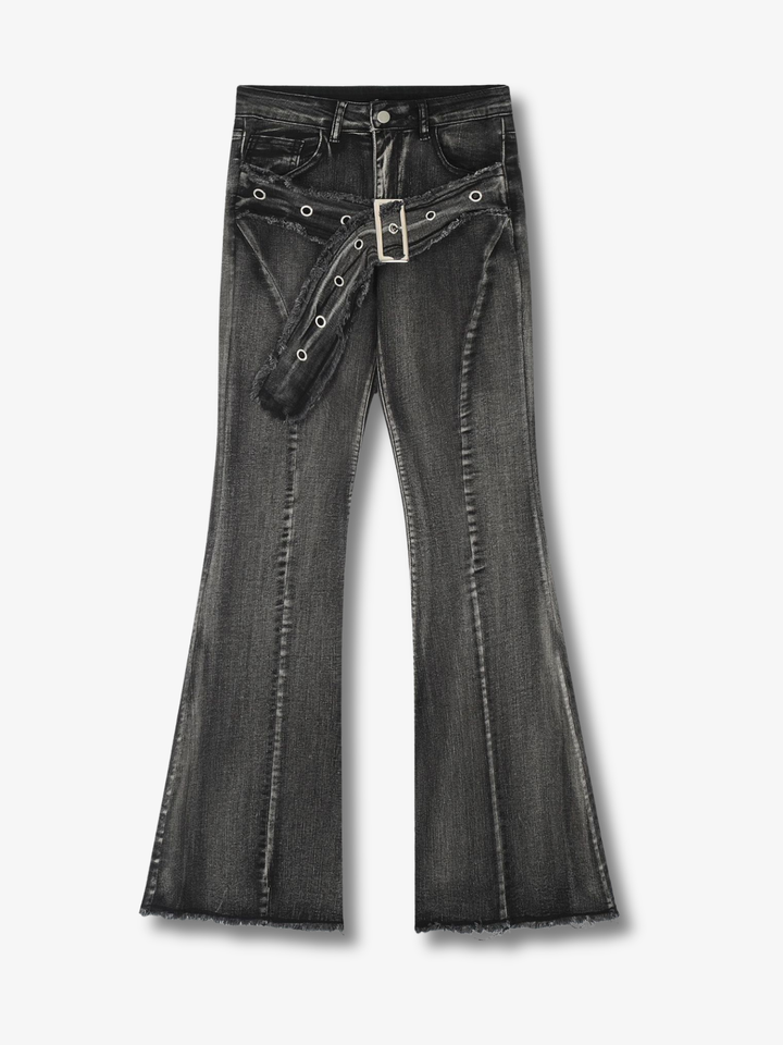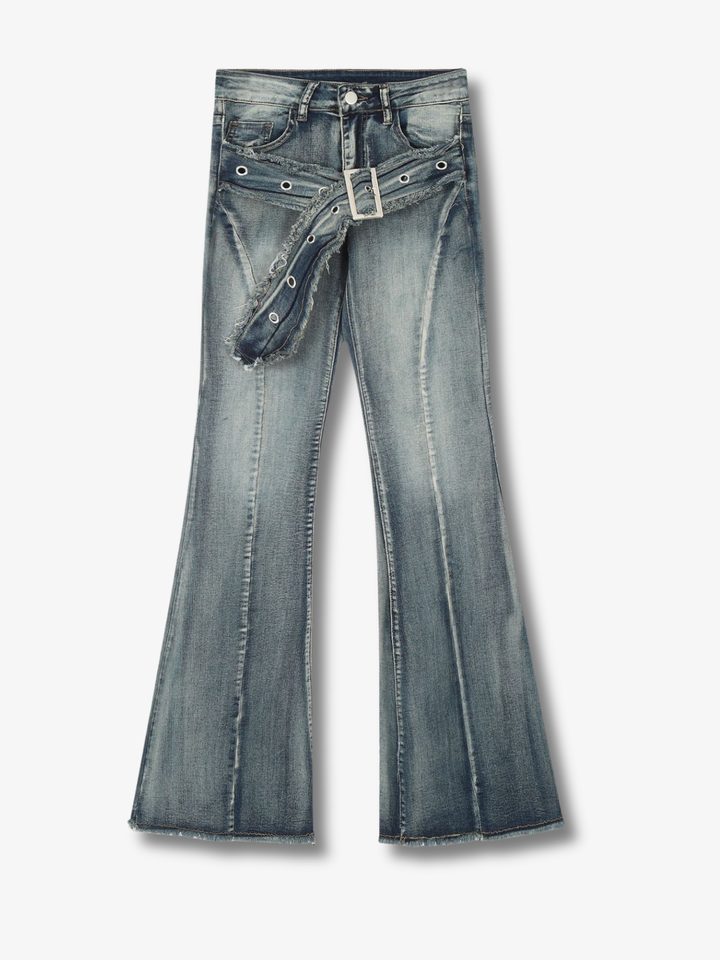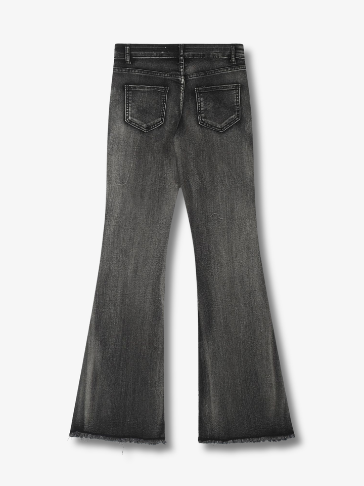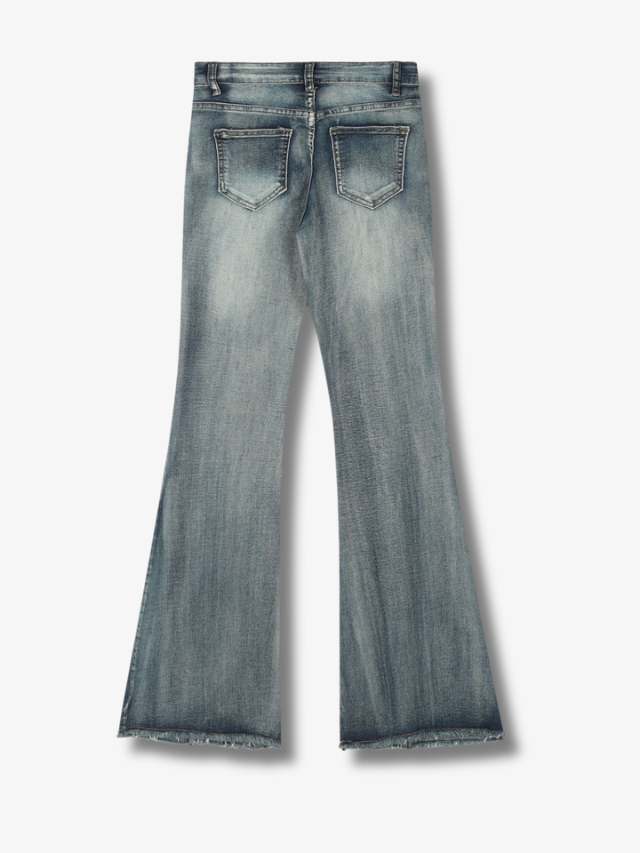 Mid-rise waist with fitted hips and exaggerated flare through the leg