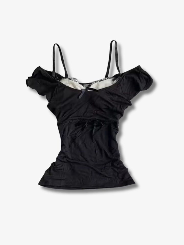 Details: Dual-strap construction with contrast neckline and mini bow accent. The off-shoulder puff sleeves and subtle ruching at the bust give a flirty, balletcore feel. Perfectly pairs with layered skirts or wide-leg pants for a Y2K-inspired statement.