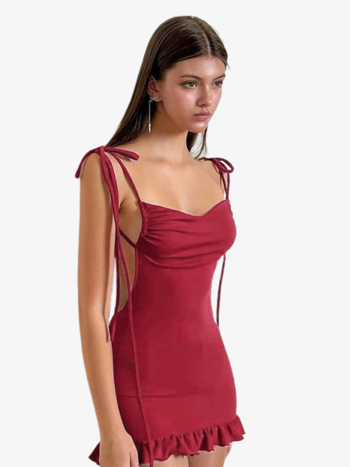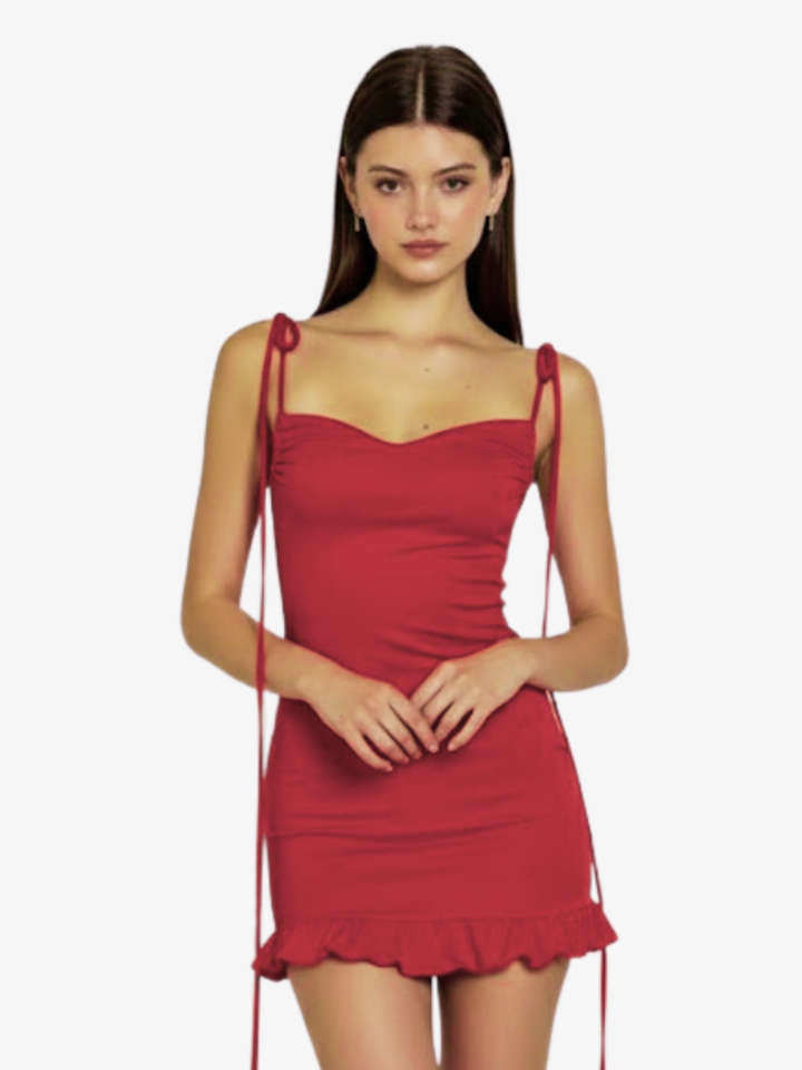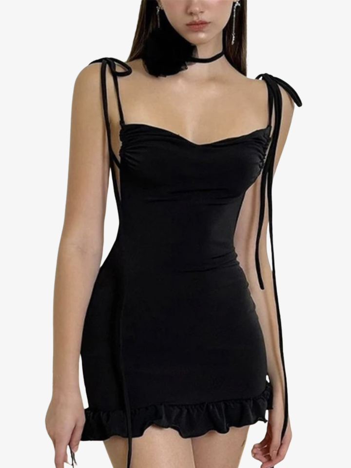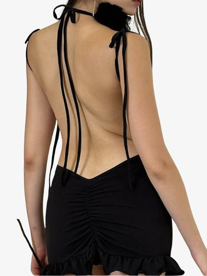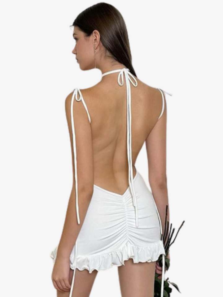 Details: This mini dress brings back early-2000s glam with flirty tie-up shoulder straps, a slight sweetheart neckline, and a ruffled hem. The open back adds a bold contrast to the soft cotton body, making it perfect for party nights, photo ops, or a statement streetwear moment.